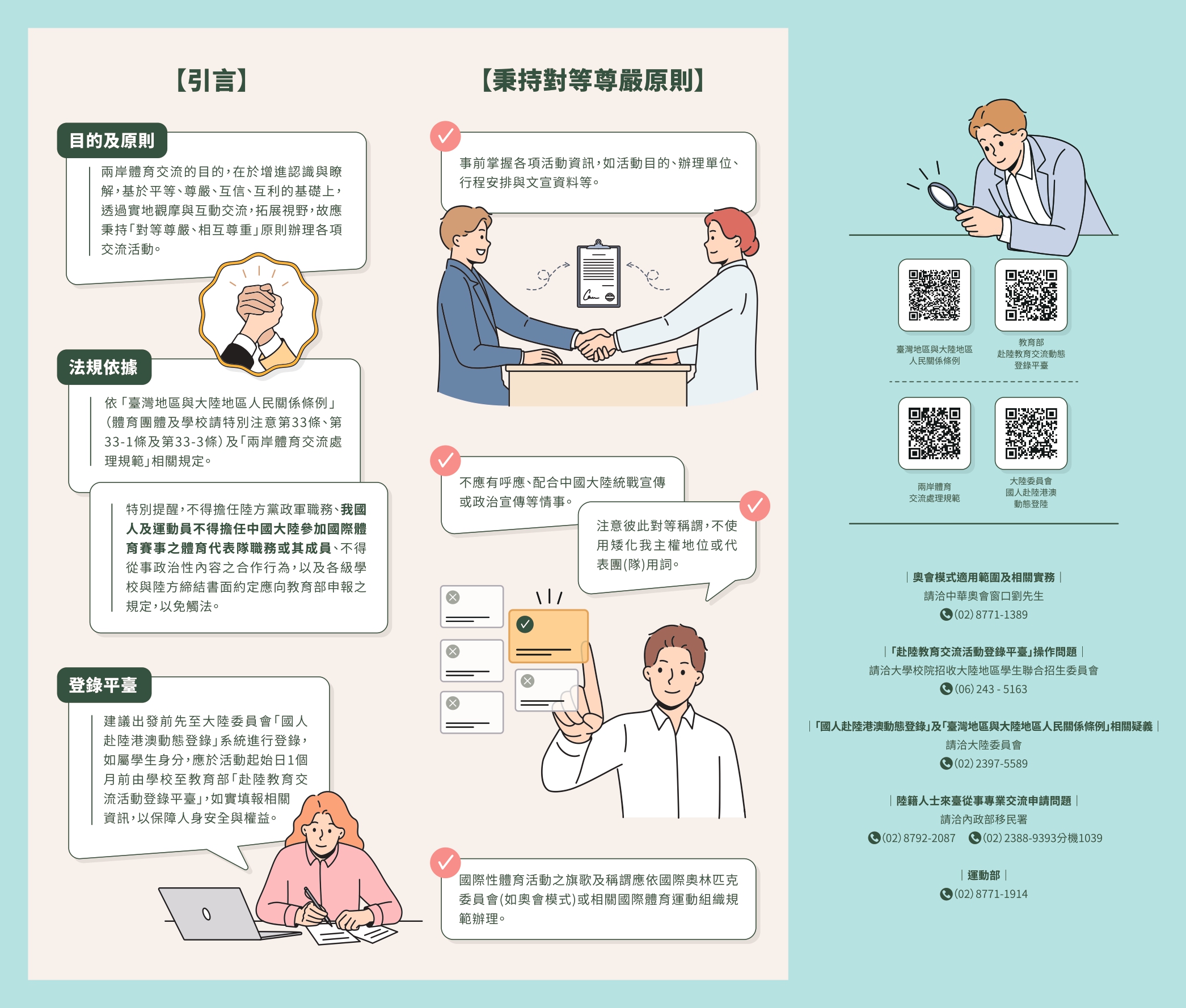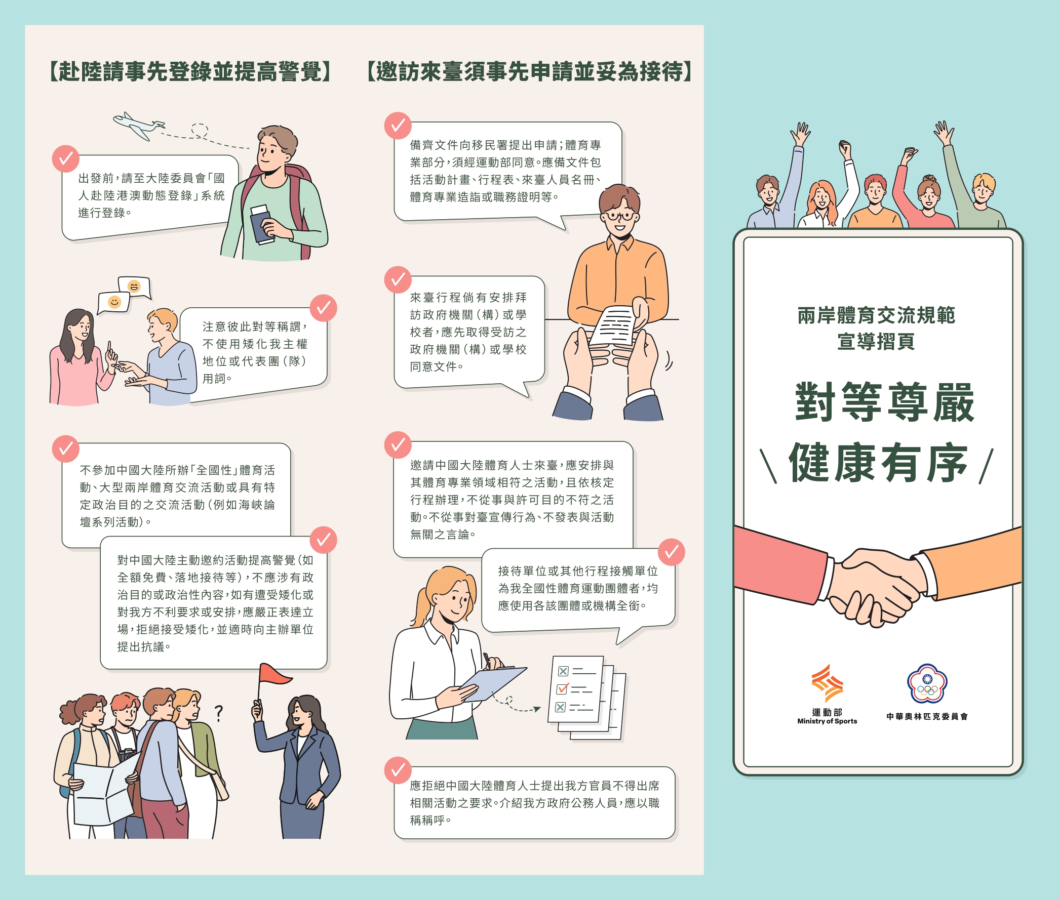 二、兩岸體育交流應秉持「對等尊嚴、相互尊重」原則,並遵守「臺灣地區與大陸地區人民關係條例」及「兩岸體育交流處理規範」相關規定。惟近日中國大陸對我統戰行為日增,貴單位或所屬單位赴參賽或進行兩岸體育交流時,應注意不得參與陸方所辦全國性體育活動、大型兩岸體育交流活動或具有特定政治目的之交流活動,並對陸方主動邀約活動提高警覺(如全額免費、落地接待等),亦應注意活動目的、辦理單位、行程安排與文宣資料等,避免協助或配合陸方宣傳。
